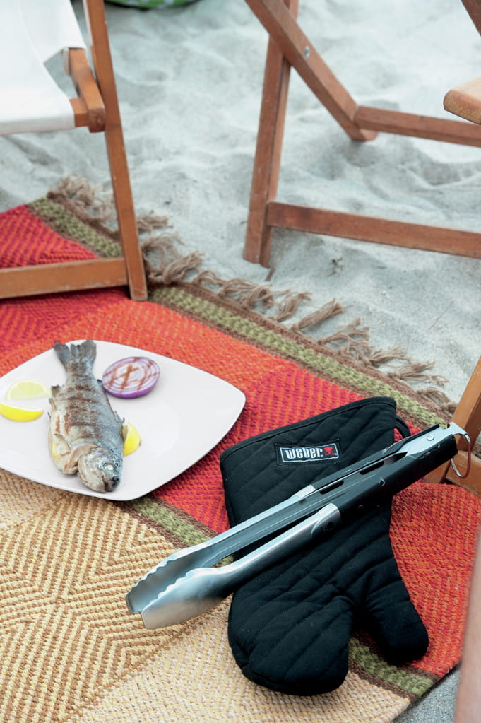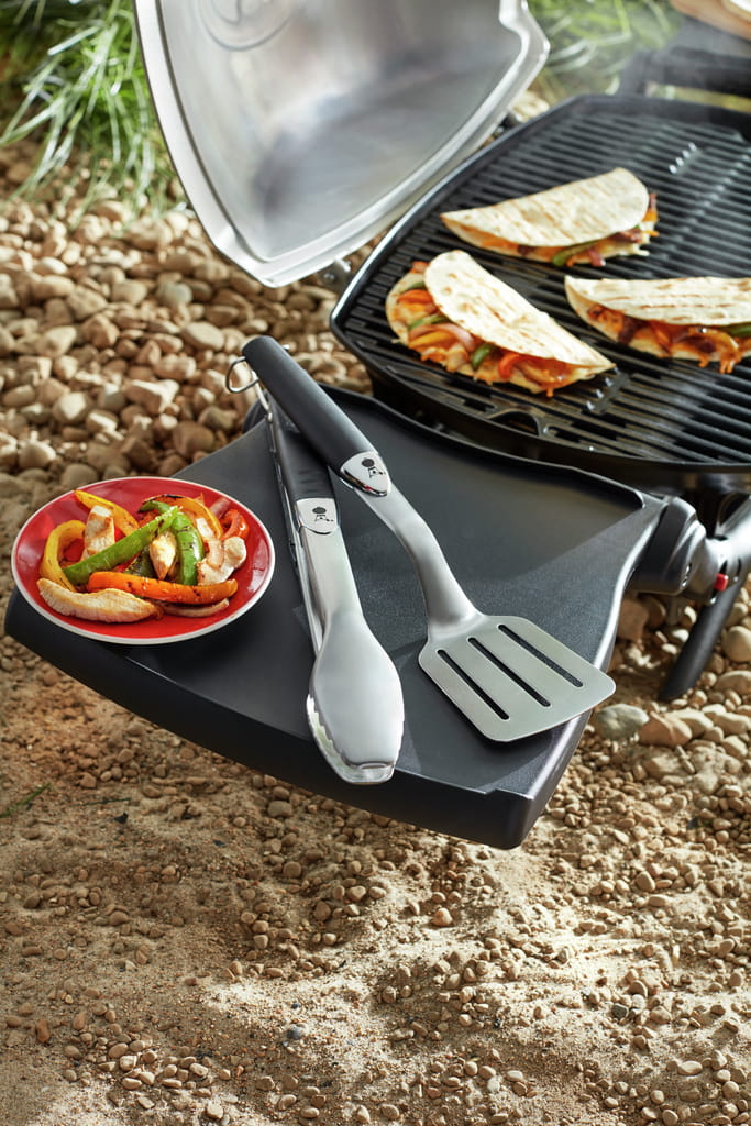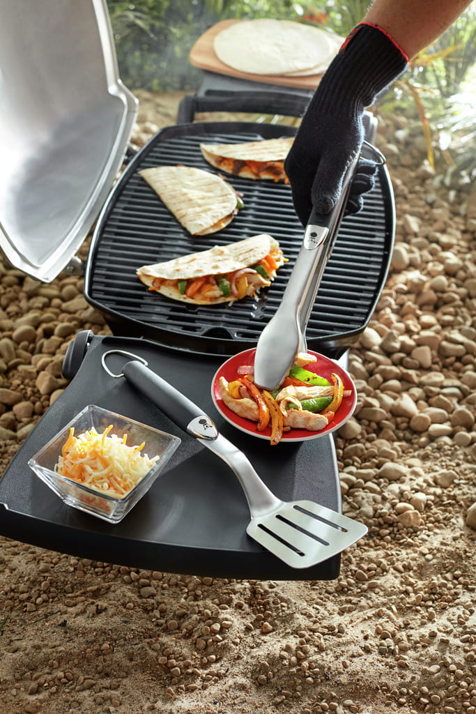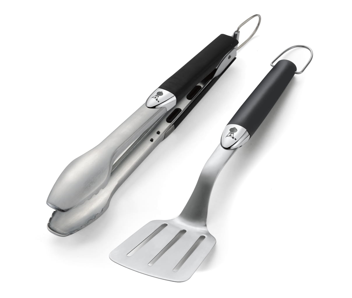 2-częściowy zestaw akcesoriów do grilla, wykonany ze stali nierdzewnej z czarnymi miękkim uchwytami, składający się ze szpatułki 38cm oraz szczypiec 36cm.