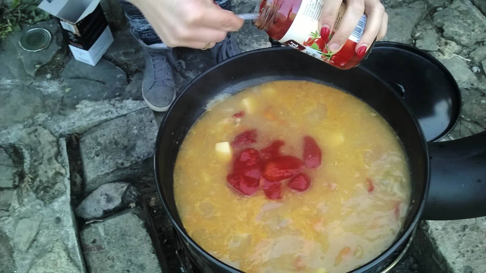 jak wszystko zacznie gęstnieć już na dobre i być miękkie wrzucamy koncentrat pomidorowy i odkrywamy pokrywkę,