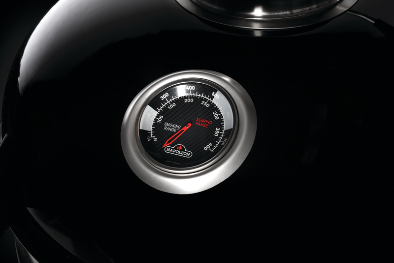 Platynowe porcelanowe wieczko z termometrem ACCU PROBE ™ dzięki chłodnemu w dotyku uchwytowi można łatwo otworzyć, a dzięki zintegrowanemu uchwytowi na wieczko przymocować do dolnej części kuli (lub kuli grillowej).