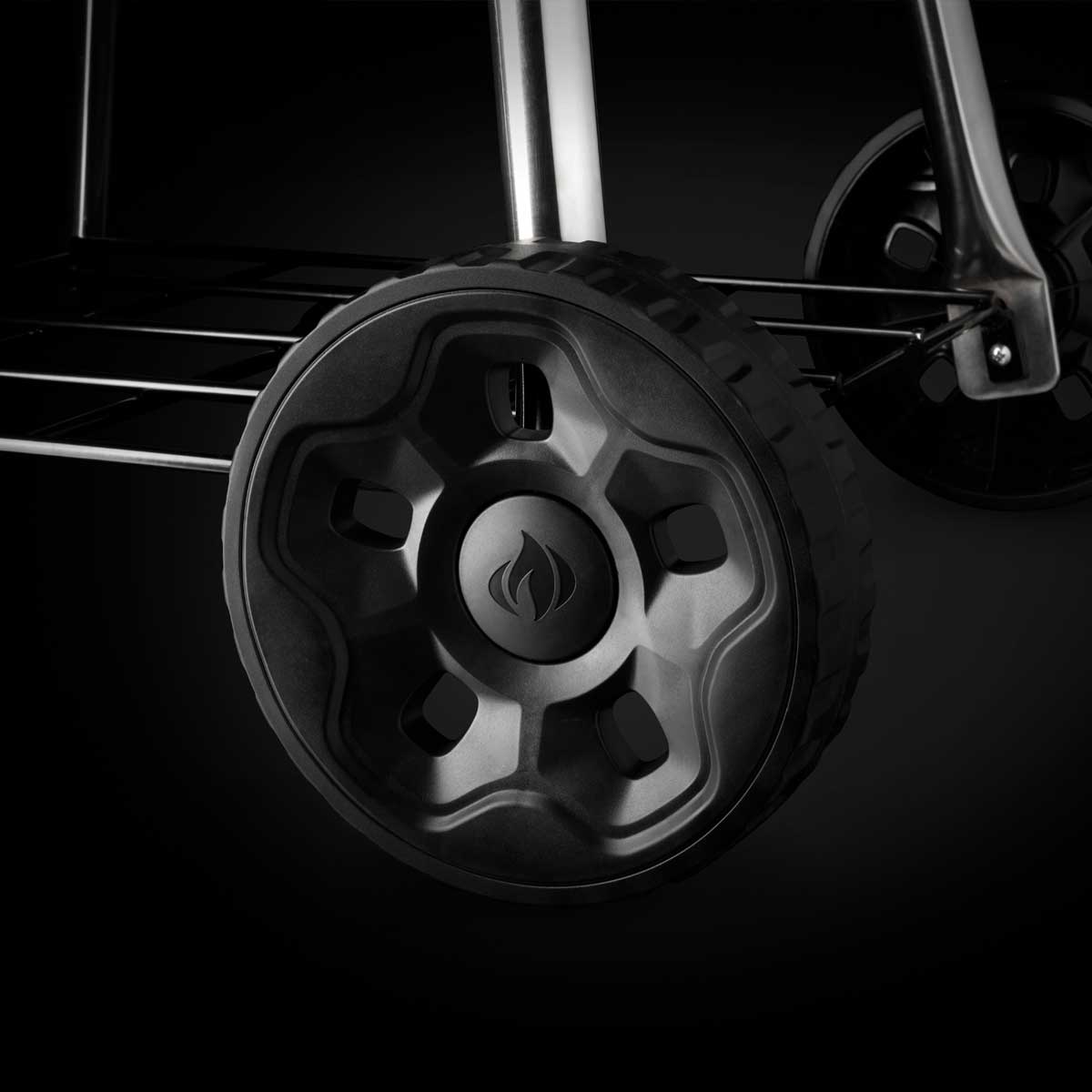 Dzięki odpornym na warunki atmosferyczne gumowym kółkom możesz z łatwością manewrować grillem Napoleon w dowolne miejsce, w którym odbywa się grill, nawet na nierównym terenie.
