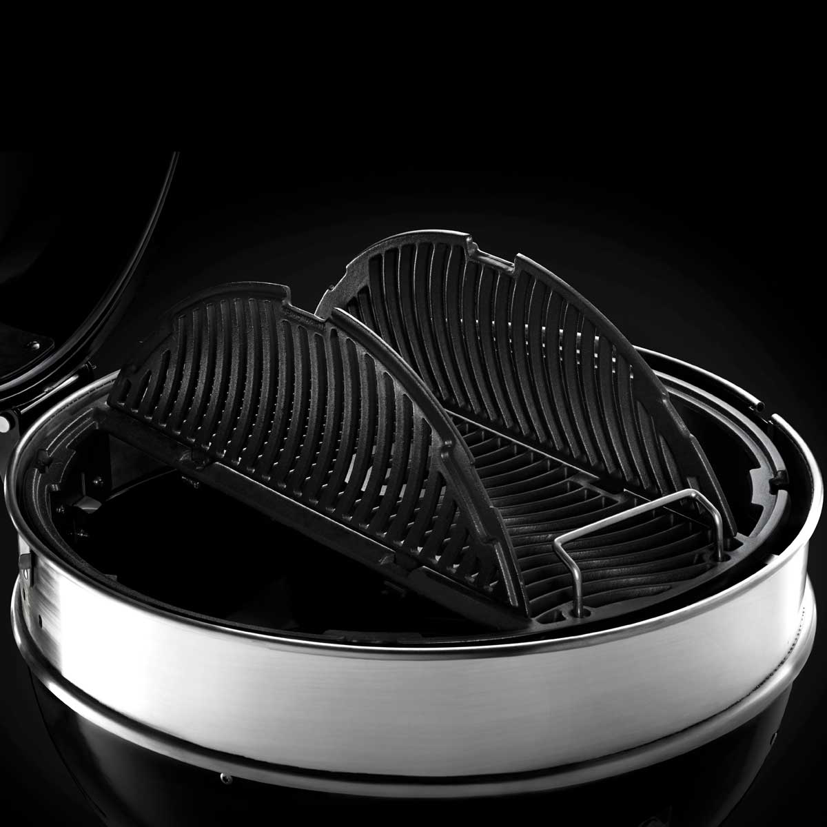 Pierścień przedłużający ze stali nierdzewnej zwiększa przestrzeń grilla i nadaje się do używania rożna. Okrągłe wyloty szpikulca można zamknąć obrotowymi osłonami, gdy nie są używane. Dodatkowo małe wycięcia pozwalają na zastosowanie czujników temperatury, dzięki czemu zawsze możesz uważnie obserwować proces gotowania.