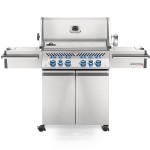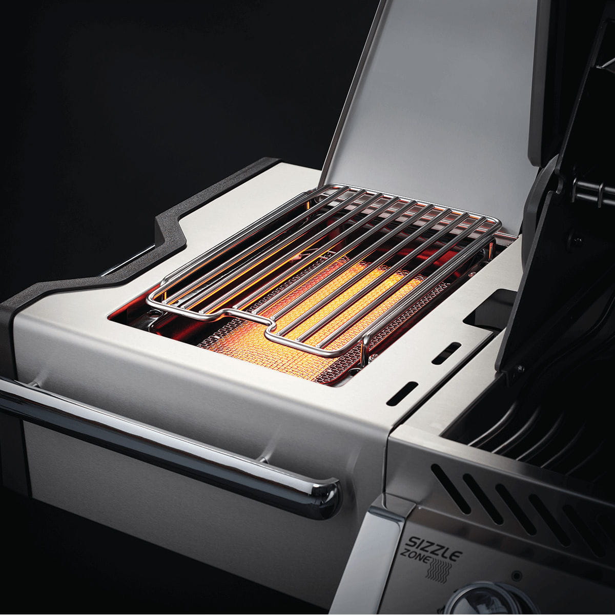 Dzięki intensywnemu ciepłu technologii podczerwieni Napoleona mięso zostanie natychmiast wyciągnięte i nie straci soczystości W tym modelu jest to boczny ceramiczny palnik na podczerwień po lewej stronie z solidnym rusztem ze stali nierdzewnej, a wewnątrz grilla na tylnej ścianie znajduje się rurowy palnik na podczerwień ze stali nierdzewnej do grillowania. |