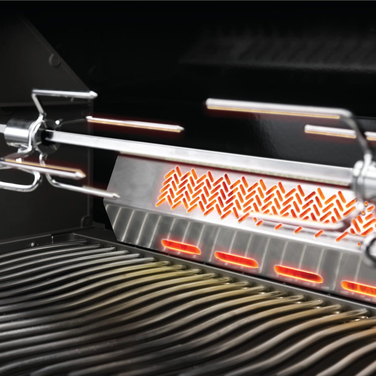 Wysokiej jakości palniki ze stali nierdzewnej o łącznej mocy 31 kW zapewniają wiele opcji przygotowania i są osadzone w wytrzymałej komorze grillowej z odlewu aluminiowego. Unikalny system dystrybucji ciepła sprawia, że bezpośrednie i pośrednie grillowanie doświadczenie oraz zapewnia chrupiące i soczyste dania, nawet z rożna.