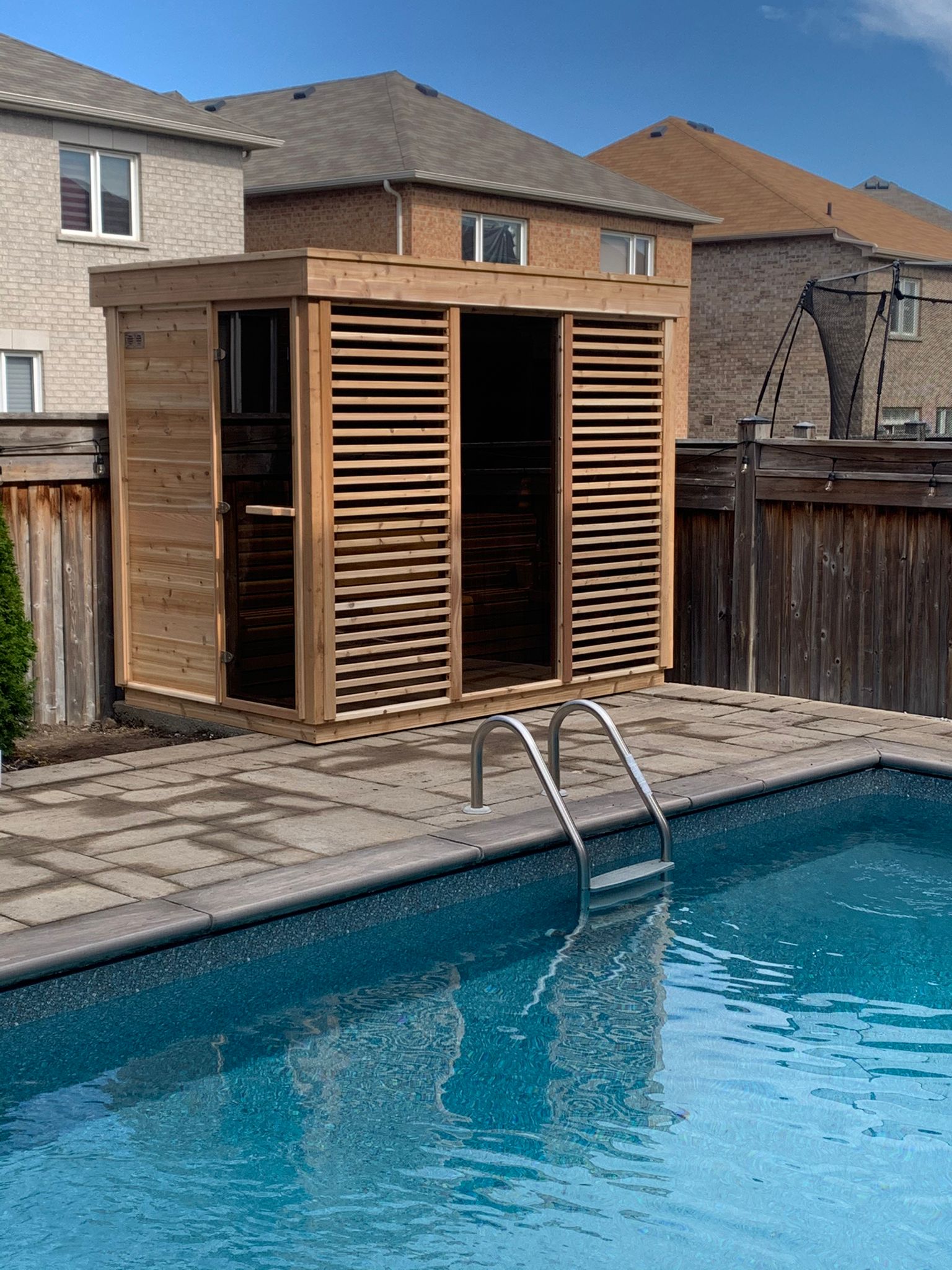 Sauna zewnętrzna Pure Cube CU550 przynosi luksusową nową klasę modułowych gotowych zestawów do sauny do Twojego domu lub domku. Wyjdź na zewnątrz dzięki dużemu, podwójnemu oknu z hartowanego szkła i drzwiom z pełnego szkła. Rozpieszczaj siebie i swoją rodzinę lub przyjaciół dzięki temu autentycznemu, nowoczesnemu zestawowi do sauny Pure Cube Sauna.
