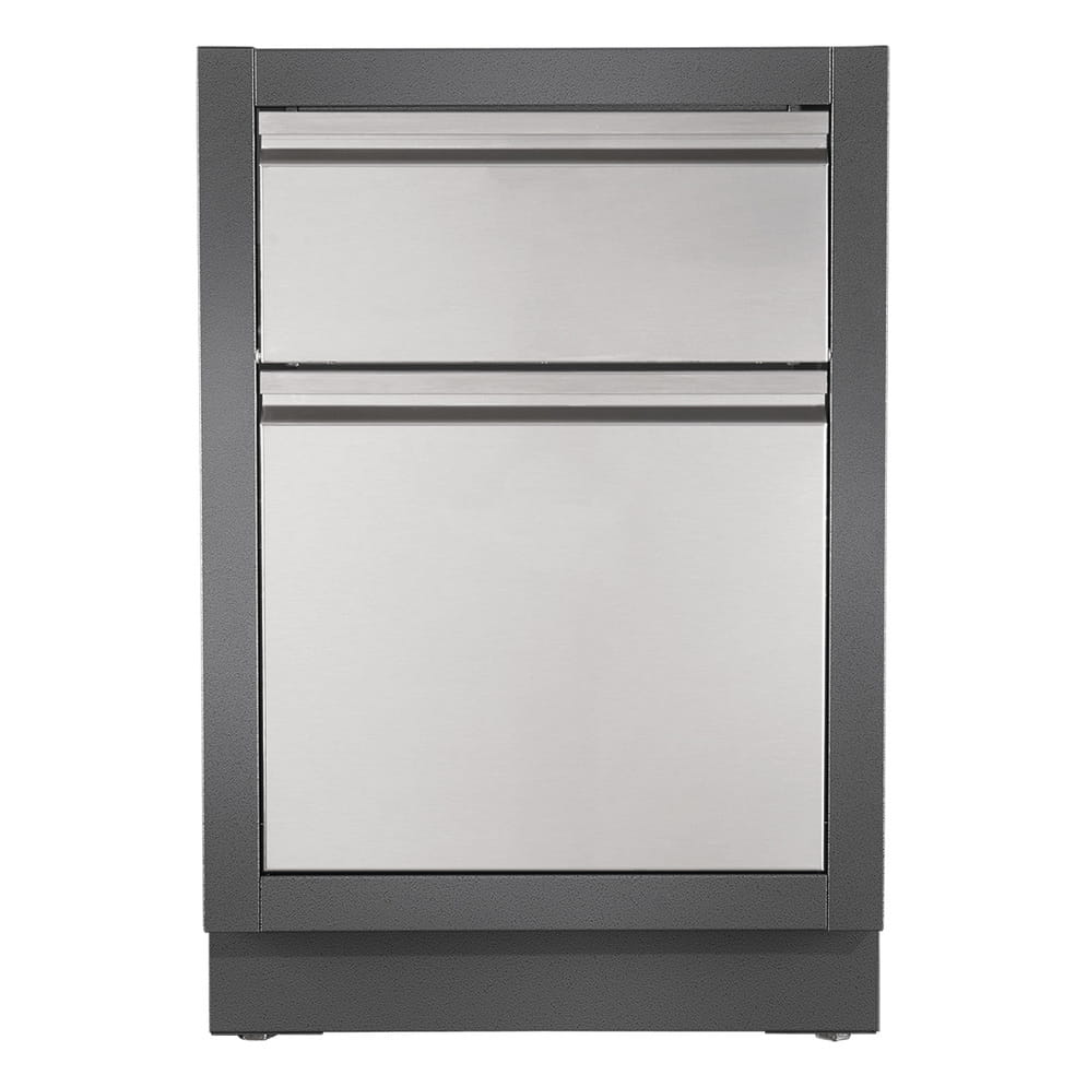 Nawet w idealnej kuchni może zrobić się bałagan. Ułatw sobie sprzątanie swojej kuchni zewnętrznej OASIS™ dzięki szafce OASIS™ z szufladą na odpady. Wyposażony w wysuwaną szufladę na kosz na śmieci z wyjmowanym pojemnikiem na odpady oraz odchylaną szufladę z uchwytem na ręczniki papierowe. Ta malowana proszkowo i galwanizowana szafka w kolorze węgla charakteryzuje się zwiększoną trwałością dzięki dwuwarstwowemu systemowi wykończenia z fakturą kamienia oraz fronty drzwi i szuflad ze stali nierdzewnej. Instalację ułatwiają otwory przewidziane na łącza gazowe i elektryczne. Stopki poziomujące zapewniają stabilne ustawienie, nawet jeśli taras nie jest idealnie równy. Uzupełnij swoją idealną kuchnię zewnętrzną OASIS™ o tę szafkę wraz z wybranym korpusem grilla oraz szafką pod grill. *Nie zawiera blatu